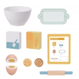 Schüssel, Teigroller, Mehl, Zucker, Eier mit Klettverschluss, Kekse, Backblech und Rezeptkarte – alles für kreatives Backen und Lernen Schritt für Schritt.