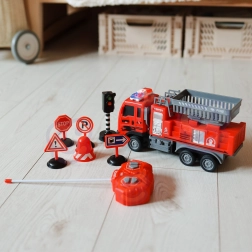 Ampel, Kegel und Verkehrsschilder erweitern die Spielmöglichkeiten, während die Lichter am Fahrzeug die Realitätsnähe und Attraktivität erhöhen.