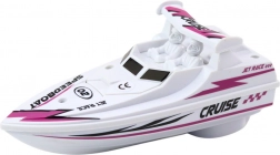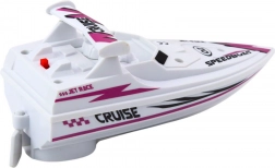 Motorisiertes Boot für Kinder, das stundenlangen Spaß auf dem Wasser bietet. Elegantes Design in Weiß mit lila-schwarzen Mustern, das jeden kleinen Abenteurer fasziniert.