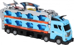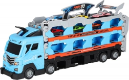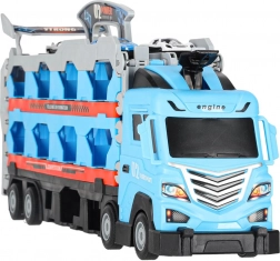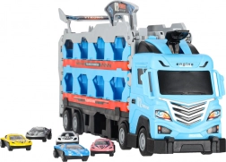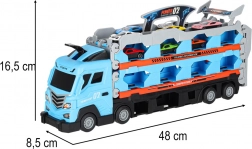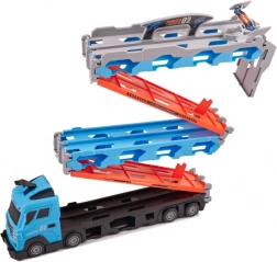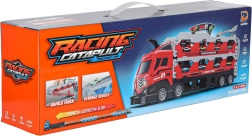 Dieses multifunktionale Set kombiniert einen Autotransporter und einen langen Rennkurs in einem. Nach dem Aufklappen wird aus dem Lkw eine doppelte Strecke mit 210 cm Länge, auf der Kinder spannende Duelle austragen und Rekorde messen können.