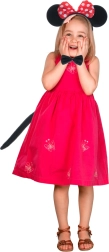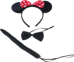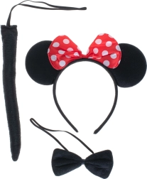 Dieses komplette Maus-Kostümset ist ideal für Karneval, Halloween, Schulaufführungen und das Spielen zu Hause. Zum ikonischen Haarreif mit roten, gepunkteten Ohren-Schleife passen die schwarze Fliege und der Schwanz – so ist die Verkleidung in wenigen Sekunden fertig.