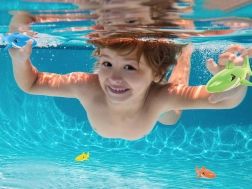 - Hai-Tauchen: Verteilen Sie die Haie im Pool oder Planschbecken. Sobald sie auf den Boden sinken, hat das Kind die Aufgabe, sie zu sammeln, wodurch es lernt, unterzutauchen und die Atmung zu kontrollieren.
