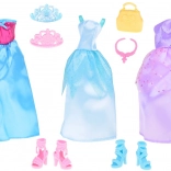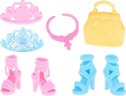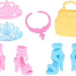 Zwei elegante Paare von Absatzschuhen verleihen dem Gesamtlook Charme und Stil. Accessoires wie eine stylische Handtasche, eine rosafarbene Kette und zwei Kronen sind perfekt für jede kleine Prinzessin.