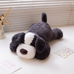Dieser Plüschhund hat ein sympathisches Gesicht mit einer großen Nase, langen, hängenden Ohren und einem flauschigen Schwanz, was ihm ein außergewöhnlich freundliches und fröhliches Aussehen verleiht. Er liegt in einer bequemen, natürlichen Position mit Pfoten nach vorne und hinten, was die kindliche Fantasie und Kreativität fördert.