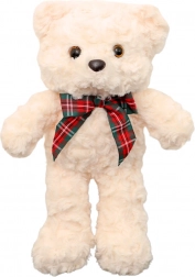 Die dekorative Schleife im klassischen Schotten-Karo-Muster verleiht dem Bären einen eleganten Akzent und festlichen sowie geschenkhaften Charakter. Der Bär hat einen stabilen, stehenden Stand, wodurch er sich hervorragend als Spielkamerad, Schlafkuscheltier oder dekoratives Element im Kinderzimmer eignet.