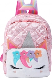 Das Modell besteht aus leichtem, aber robustem Material, das unempfindlich gegen Verschmutzungen und Beschädigungen ist. Die Vorderseite ist mit einer Filzapplikation eines Einhorns, Blumen mit Ohren und einem glitzernden Horn verziert. Der Rucksack verfügt über ein geräumiges Hauptfach, eine kleinere Innentasche und eine äußere Reißverschlusstasche für eine einfache Organisation. Verstellbare Träger sorgen für Komfort und Anpassung an die Körpergröße des Kindes.