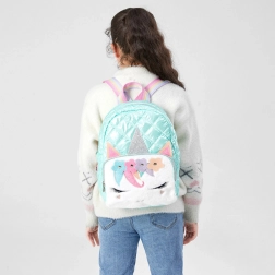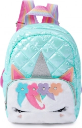Das Modell ist aus robustem und dennoch leichtem Material gefertigt, welches dem täglichen Gebrauch standhält. Auf der Vorderseite befindet sich eine weiche Applikation mit Einhornmotiv, einschließlich herausstehender Ohren und Horn, was seine Einzigartigkeit unterstreicht. Der Rucksack verfügt über ein geräumiges Hauptfach, eine kleinere Innentasche und eine zusätzliche Außentasche mit Reißverschluss.