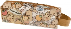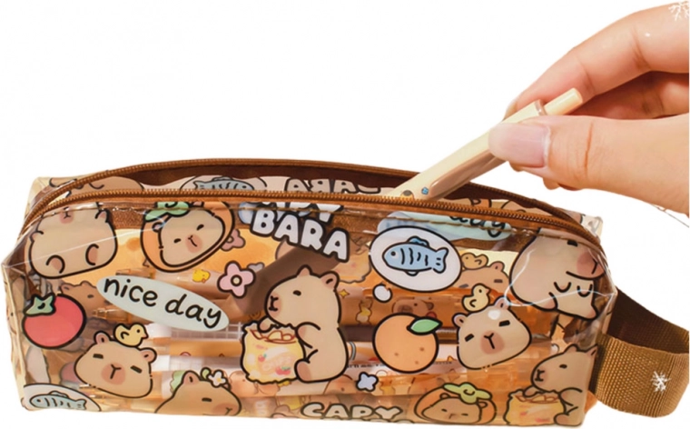 Dieses Schulmäppchen ist aus robustem, wasserdichtem PVC gefertigt, was es perfekt für den täglichen Gebrauch in der Schule und in der Freizeit macht. Das durchsichtige Material mit buntem Druck ermöglicht einen einfachen Blick ins Innere. Das Mäppchen ist mit einem braunen Seitenhenkel für leichtes Tragen ausgestattet.