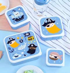 Genießen Sie das praktische Set von Lunchboxen mit Piratenmotiv. Das Set enthält vier Boxen in verschiedenen Größen, die ideal für den Transport von Mittagessen und Snacks für Kinder und Erwachsene sind.