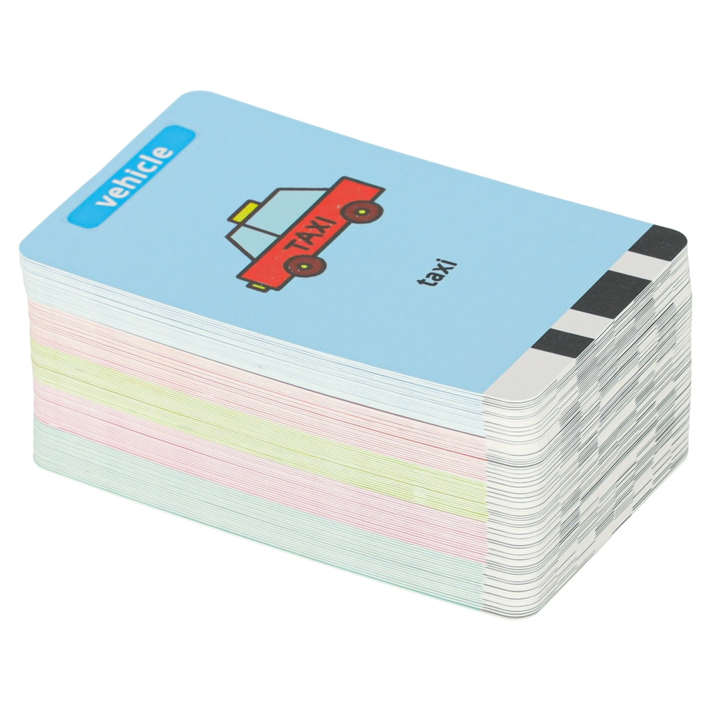 Ein Set aus 100 Karten mit Illustrationen und englischen Bezeichnungen unterstützt das natürliche Aneignen von Wortschatz durch spielerische Interaktion.