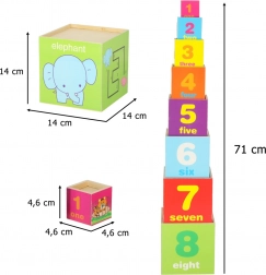 Dieses Set enthält 8 farbige Holzwürfel, die sich zu einem Turm von bis zu 71 cm Höhe stapeln lassen! Jeder Würfel hat 8 aktive lehrreiche Seiten, die verschiedene Spiel- und Lernmöglichkeiten bieten.
