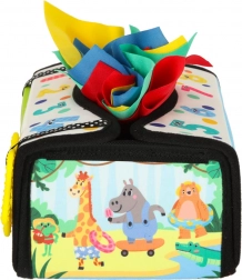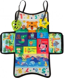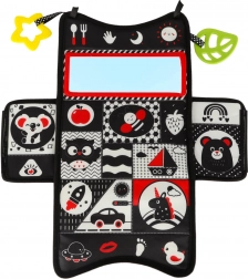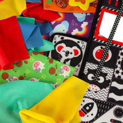 Spektrum sensorischer Reize: Enthält 8 bunte Taschentücher und 3 stärkere Stoffe mit einzigartigen Mustern. Beim Entfalten der Matte entdeckt das Kind einen Spiegel und zwei Gummibeißringe. Jedes Element stimuliert das Sehen und Fühlen, einige Stoffe enthalten sanft raschelnde Folie zur Entwicklung des Gehörs.