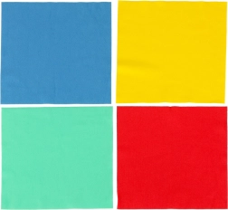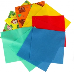 Das Set enthält: einen bunten, entfaltbaren Behälter, 3 stärkere bunte Taschentücher mit Bildern, 8 Stofftaschentücher, Gebrauchsanweisung.