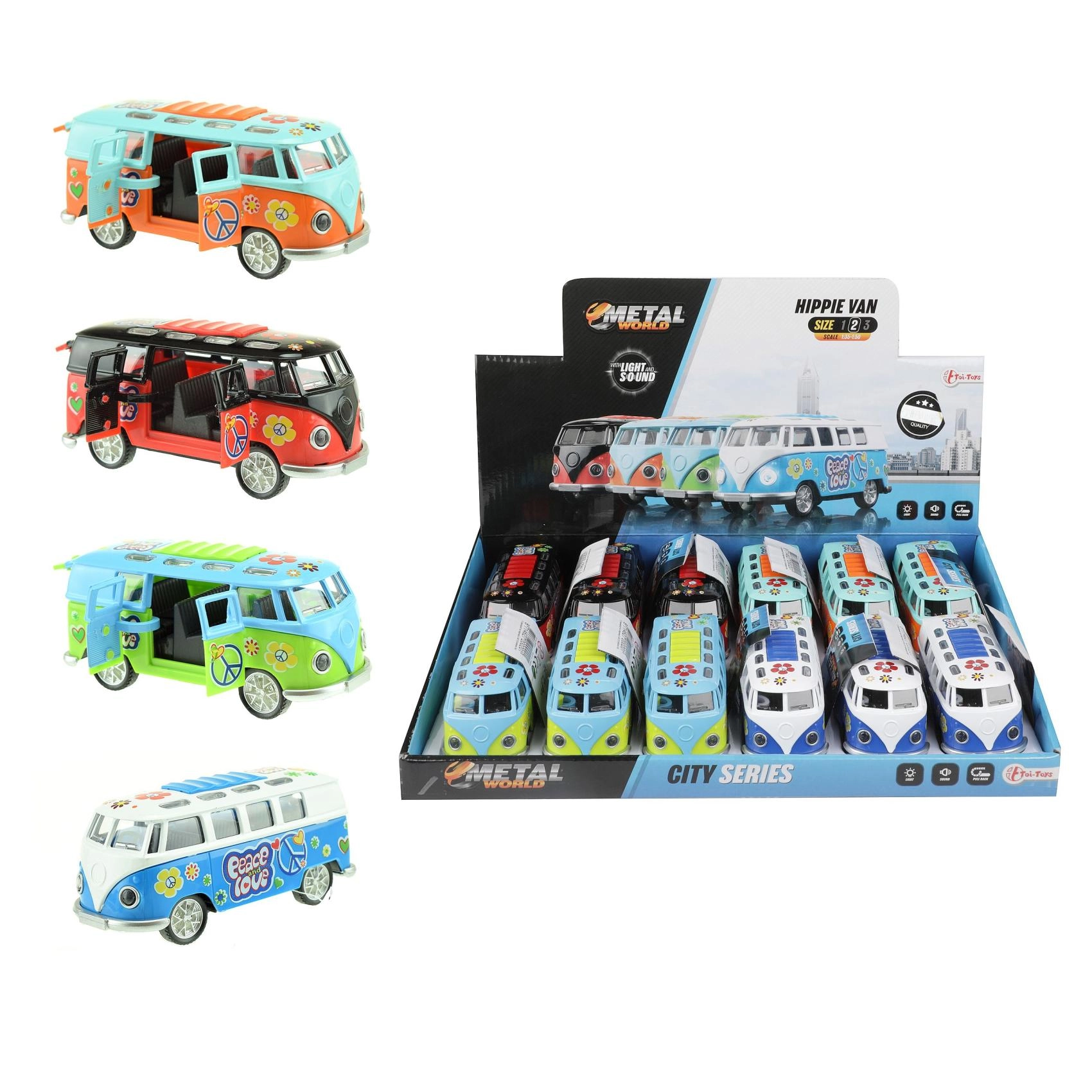 Entdecke den miniaturisierten Retro-Bus, der auf den ersten Blick mit seinem farbenfrohen „Hippie“-Stil begeistert und nach dem Start mit Effekten überrascht. Einfach nach hinten ziehen und loslassen – das Schwungrad sorgt für eine flotte Fahrt, während Lichter und Motorsound das Erlebnis unterstreichen.