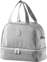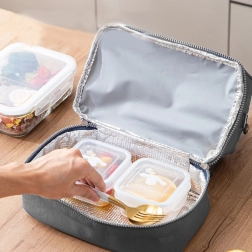 Dank ihrer zweischichtigen Konstruktion und isolierten Thermoschicht hält die Thermo-Isoliertasche effektiv die Temperatur der gelagerten Produkte – sowohl warmen Speisen als auch kalten Getränken und Snacks. Das Hauptfach ist geräumig und bietet Platz für Lunchboxen, Obst, Getränke, Flaschen oder Thermosbecher. Die obere Tasche ist für Kleinigkeiten und kleinere Accessoires wie Riegel, Joghurts, Servietten oder Besteck konzipiert, was ermöglicht, dass der Inhalt organisiert und leicht zugänglich bleibt.