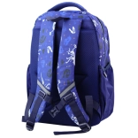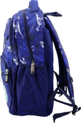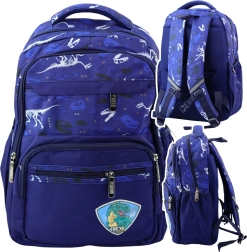 Der blaue Schulrucksack mit Dinosauriern und T-Rex-Aufnäher bietet zwei geräumige Fächer. Das Hauptfach hat ein Trennfach zur einfachen Organisation von Büchern, Heften und anderen Schulutensilien. Drei Fronttaschen mit Reißverschluss und elastische Seitentaschen bieten Platz für eine Flasche oder Bidon.