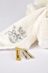 Der Bär ist mit einer Decke ausgestattet, die leicht in seinem Bauch verstaut werden kann, was beim Reisen oder Aufbewahren sehr praktisch ist. Doudou ist mit feiner Stickerei und Satinbändern mit französischen Aufschriften verziert, die jedem Kuscheln Sanftheit verleihen.