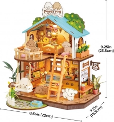 Erleben Sie den Zauber der Kreation mit einem Haus, das ein geräumiges Schlafzimmer, einen gemütlichen Wohnbereich mit Schaukel und Essbereich sowie einen Balkon im ersten Stock enthält. Jedes Detail ist präzise ausgeschnitten und umfasst weiche Bettwäsche, einen Nachttisch mit Lampe, einen Laptop, ein Bücherregal, einen Cappuccino-Automaten und Blumen. Dank der LED-Beleuchtung im Erdgeschoss und ersten Stock fühlt sich Ihr Liebling wohl.