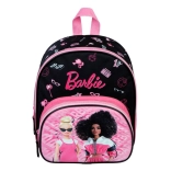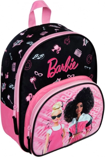 Der Rucksack mit Barbie-Motiv bietet ein attraktives Aussehen in einer pink-schwarzen Kombination mit Bildern der beliebten Puppe.