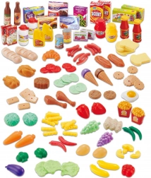 Das Set enthält: 120 verschiedene Elemente, darunter Obst, Gemüse, Backwaren, Snacks, Getränke und Verpackungen.