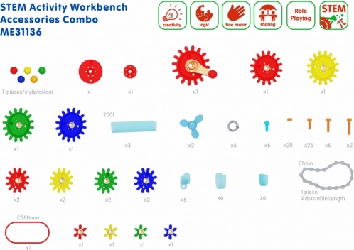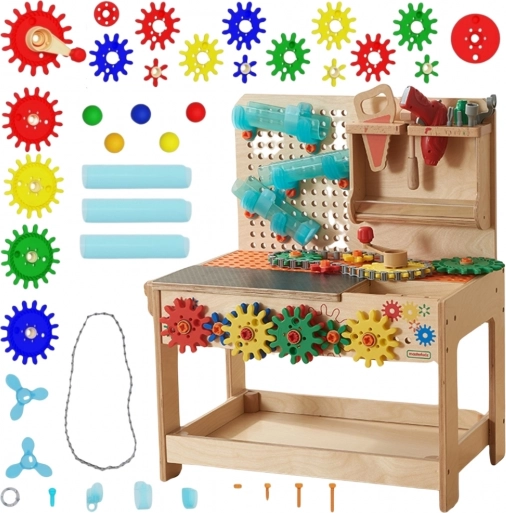 Die Werkbank besteht aus hochwertigem Holz und verfügt über eine Arbeitsfläche mit Löchern für unbegrenzte Kombinationen. Kinder können schrauben, verbinden, Zahnräder aneinanderreihen und mit einer Kurbel antreiben, Kugeln durch transparente Bahnen führen sowie bewegliche Konstruktionen mit Riemen und Kette bauen. Die lackierte Oberfläche gewährleistet Beständigkeit gegen UV-Strahlung, Flecken und Kratzer.