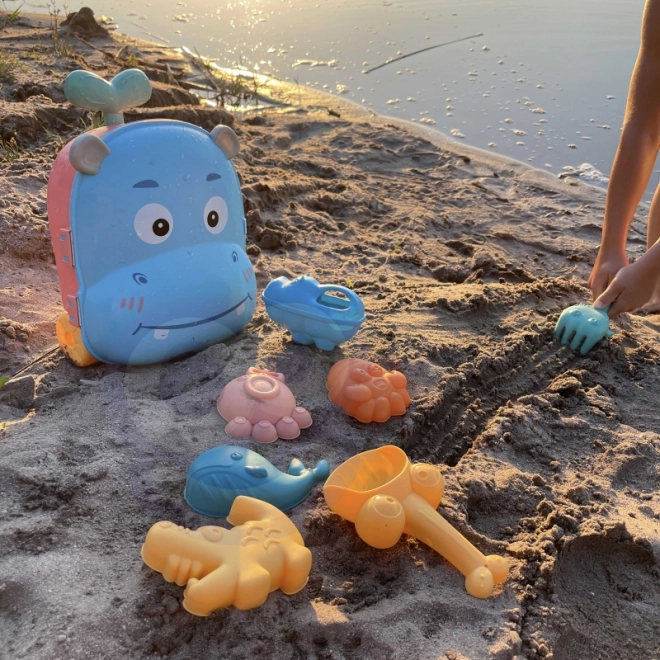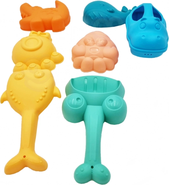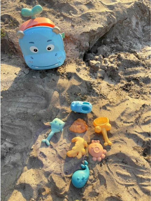 Meeresbewohner, ein Eimer in Nilpferdform und weiteres Zubehör fördern Vorstellungskraft und Feinmotorik beim Formen von Sand.