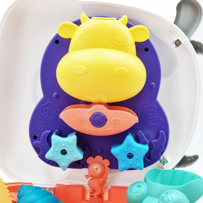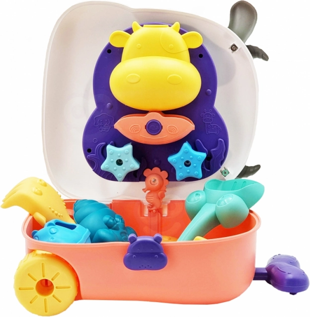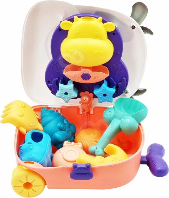 Legt man den Koffer „auf den Rücken“, entsteht ein einfacher Wassertisch – fülle den unteren Teil, gieße mit dem Becher um und beobachte den Wasserfluss. Das Set ist geeignet für Kinder ab 3 Jahren und bietet Spaß auch zu zweit.
