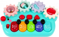 Im oberen Teil des Klaviers sind drehbare Zahnräder angebracht, die das Kind drehen kann, um seine Hand-Auge-Koordination und Feinmotorik zu üben. Dank der kompakten Größe ist das Spielzeug ideal sowohl für das Spielen zu Hause als auch für unterwegs. Es ist aus sicheren Materialien gefertigt und hat angenehme Pastellfarben.