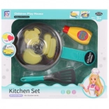 Set Inhalt: Pfanne, Ketchupflasche, Pfannenwender und drei imitierte Nahrungsmittel.