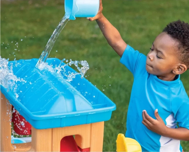 Der Kindertisch für Wasseraktivitäten der Marke Step2 bringt vielseitigen Spaß. Der doppelte Behälter erzeugt einen realistischen Regeneffekt – einfach Wasser eingießen und der Spaß kann beginnen! Wasser aus dem oberen Behälter erzeugt einen realistischen Regeneffekt. Auf der einen Seite fällt das Wasser in einen Eimer, der sich bei voller Füllung umkippt, während es auf der anderen Seite durch eine Rinne zu einem drehenden Windrad fließt. Das Set enthält auch eine Rampe für die Tiere, einen Eimerhalter und ein Sieb. Das alles endet in einem kleinen Becken am Boden.