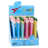 Der obere Teil des Stifts ist mit einer Gummifigur eines Dinosauriers verziert, die als dekoratives Element dient und dem Ganzen Charme verleiht. Dank der Kappe ist die Schreibspitze gut vor dem Austrocknen geschützt und ein eingebauter Knopf aktiviert die effektvolle LED-Beleuchtung, die bei jedem Drücken aufleuchtet.