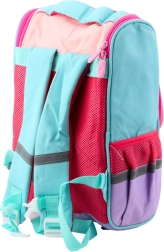 Die Seiten des Rucksacks haben zwei elastische Taschen für Flaschen oder Trinkflaschen und ein Brustgurt unterstützt die richtige Gewichtsverteilung. Reflektierende Elemente verbessern die Sichtbarkeit des Kindes auf der Straße.