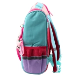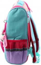 Der Rucksack hat ein großes Hauptfach, das ausreichend Platz für Bücher, Hefte und andere Schulmaterialien bietet. An der Vorderseite befindet sich eine abnehmbare Tasche mit einem Vogel, die separat als Etui oder dekorativ verwendet werden kann. Am Reißverschluss ist zudem ein Anhänger mit einem niedlichen Kaninchen angebracht.