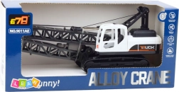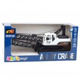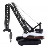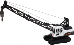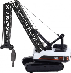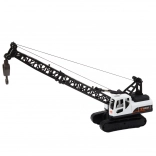Der Kran verfügt über einen beweglichen Ausleger mit Haken, der angehoben und abgesenkt werden kann. Der Ausleger des Krans bewegt sich an Gelenken und die drehbare Basis ermöglicht eine vollständige Drehung von 360°. Die gesamte Konstruktion ist auf einem stabilen Raupenfahrwerk aufgebaut, was den Realismus und die Stabilität erhöht. Das Spielzeug ist in einer weiß-schwarzen Farbgebung mit Details gestaltet, die professionelle Baumaschinen nachahmen.