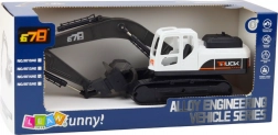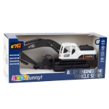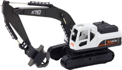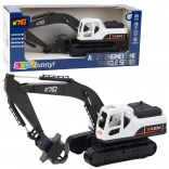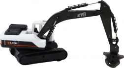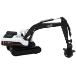 Der Kettenbagger ist mit einer Greifschaufel anstelle eines herkömmlichen Löffels ausgestattet, hat einen Gelenkarm mit mehreren beweglichen Gelenken und eine 360°-Drehung der Basis. Das Laufwerk auf Ketten gewährleistet Stabilität und einen robusten Look, ähnlich wie echte Baumaschinen. Das Modell in einer modernen schwarz-weiß-grauen Farbkombination passt perfekt in jede Sammlung von Bau-Spielzeugen.