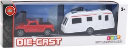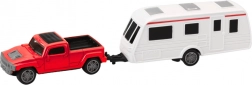 Miniatur-Auto-Set mit Wohnwagen ist ideal für Kinder, die Autos, Reisen und Abenteuer lieben. Das rote Geländefahrzeug mit Metallkarosserie und Wohnwagen bildet ein einzigartiges Set, das durch sein realistisches Aussehen und seine solide Verarbeitung besticht.