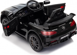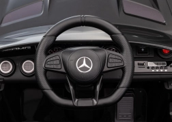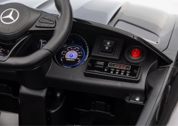 Stilvolles und starkes Kinderauto Mercedes GTR in schwarzer Farbe zieht alle Blicke auf sich mit seinem kraftvollen Design, verlängerter Motorhaube und vertikalen Gitterrippen. Dieses Auto ist mit zwei Motoren mit einer Leistung von jeweils 45W, einer Batterie von 12V4,5Ah und einem Automatikgetriebe mit drei Geschwindigkeitsstufen ausgestattet.