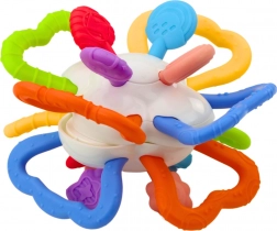 Dieses Spielzeug besteht aus zwei beweglichen, drehbaren zentralen Teilen, die das Kind bewegen kann, was bei der Übung des Greifens hilft und die Hand-Auge-Koordination entwickelt. Darüber hinaus ist das gesamte Spielzeug von bunten, flexiblen Griffen mit verschiedenen Formen und Texturen umgeben, die aus einem sicheren, weichen gummiartigen Material hergestellt sind. Diese Elemente sind ideal zum Beißen und bieten Erleichterung beim Zahnen.