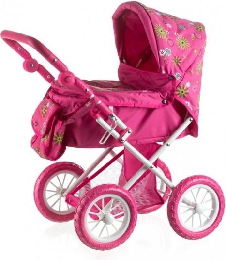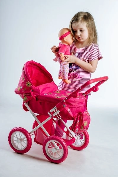 Eleganter Puppenwagen ist ideal für kleine Mütter. Er verfügt über einen praktischen Stauraum und eine Tasche für Notwendigkeiten.