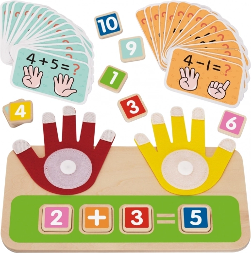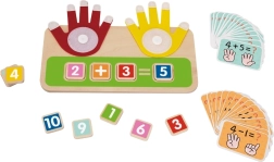 Holzsockel mit zwei beweglichen Händen (rot und gelb), die das Zählen mit den Fingern simulieren