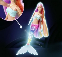 Die Steffi Meerjungfrau Puppe bringt endlose Spiel- und Spaßmöglichkeiten in die Welt der Kinder. Ihre magische Leuchtflosse erstrahlt in wunderschönen Regenbogenfarben und verleiht jedem Unterwasserabenteuer einen Hauch von Magie. Dank der Wasserfestigkeit müssen Sie sich keine Sorgen um Beschädigungen machen, und Ihr Kind kann sowohl im Wasser als auch an Land spielen.