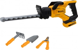 Das Kinder Gartenset enthält eine realistische Spielzeugversion einer elektrischen Heckenschere mit beweglichen Kunststoffklingen. Einfach den Knopf drücken und das sichere „Schneiden“ kann beginnen! Die Schere hat einen ergonomischen Griff, ein abnehmbares Batteriemodul und Elemente, die die Funktionsweise echter Gartengeräte nachahmen. Außerdem enthält das Set Handwerkzeuge: Rechen, Schaufel und Astschere.