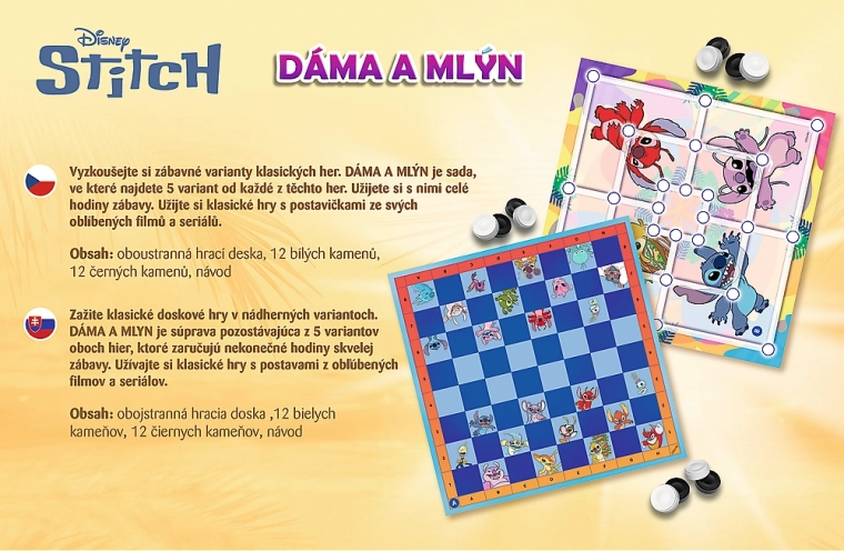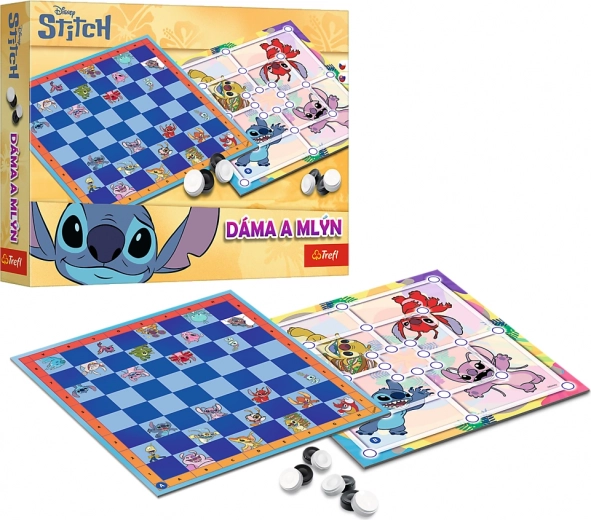 Dame und Mühle mit Lilo-&-Stitch-Motiv. Zwei Spiele in einer Packung, zweiseitiges Brett, Spielsteine und Anleitung. Fördert Logik und Konzentration. Alter 5+, Maße 29×19×4 cm.