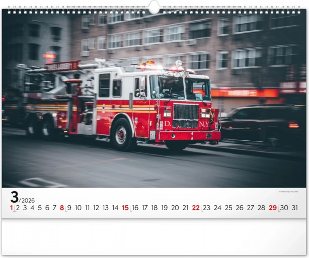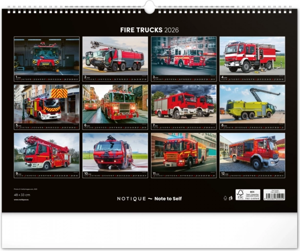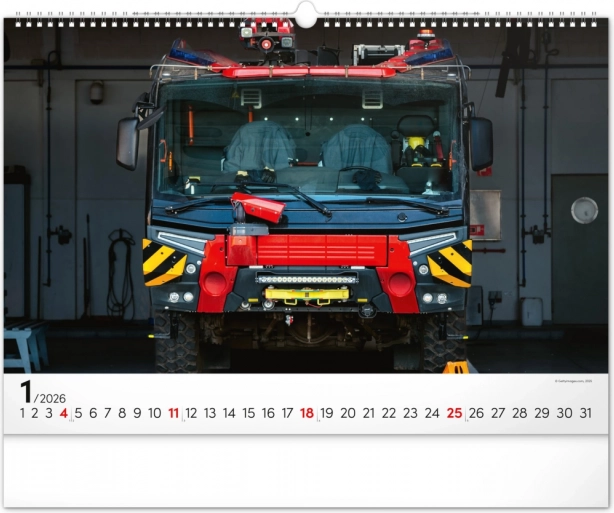 Jeder Monat des Kalenders zeigt einzigartige Fotos von Feuerwehrfahrzeugen, die durch ihre Dynamik und feurige Atmosphäre beeindrucken. Der Kalender hat ein universelles Kalendarium, das übersichtlich auf einem eleganten schwarzen Hintergrund platziert ist.