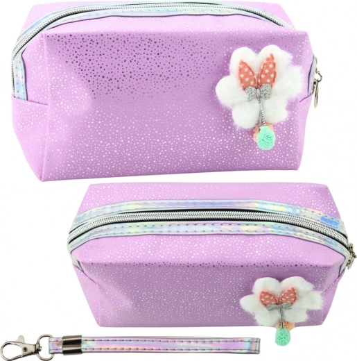 Die stilvolle Kosmetiktasche ist ein einzigartiges Accessoire für die Schulausstattung oder den Alltag. Gefertigt in einem effektvollen Lilaton und verziert mit feinen, glitzernden Partikeln, zieht sie dank ihres auffälligen Designs alle Blicke auf sich. Auf der Vorderseite der Tasche befindet sich eine niedliche Applikation in Form einer flauschigen Wolke mit Schleife, an der zwei dekorative Kügelchen befestigt sind, die dem Ganzen einen besonderen Charme verleihen.