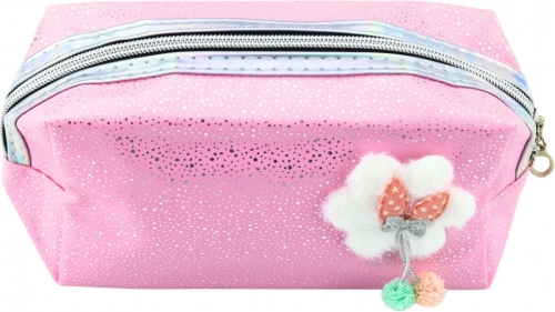 Diese Tasche für Kosmetik oder Schulutensilien ist in einem eleganten Rosaton gefertigt und mit zartem Glitzer verziert. Auf der Vorderseite befindet sich eine niedliche Applikation in Form einer flauschigen Wolke mit Schleife, an der zwei dekorative Kügelchen befestigt sind, die dem Gesamtbild einen einzigartigen Charme verleihen.