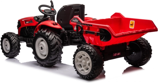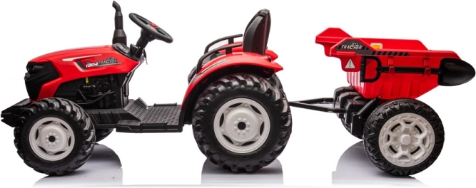 Roter 24V Akku-Traktor mit Anhänger. Ideal für Kinderabenteuer im Freien mit Sicherheit und Spaß.