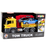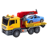 Der Abschleppwagen ist mit einem beweglichen Kranarm mit „Pump“-Hebemechanismus ausgestattet – einfach mehrmals die orangefarbene Taste drücken und der Arm hebt sich automatisch. Das Absenken erfolgt über einen Schieberegler, was dem Kind die volle Kontrolle über den Ablauf gibt.