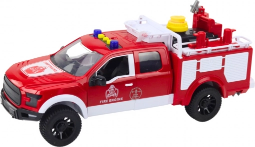 Das Feuerwehrauto besteht aus hochwertigem Kunststoff und enthält viele funktionale Elemente. Auf dem Dach des Fahrzeugs befindet sich ein abnehmbarer Tank mit Pumpe und flexiblem Schlauch, der das Spielen von Feuerlöschen durch Spritzen von Wasser ermöglicht. So kann sich das Kind vorstellen, ein echter Feuerwehrmann zu sein und imaginäre Brände zu Hause, im Garten oder auf dem Spielplatz zu „löschen“.