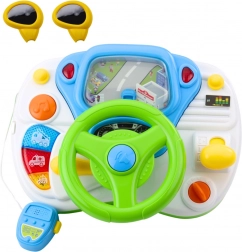 Das Simulator-Panel ist mit einem großen Lenkrad mit Hupe, einem drehbaren Zündschalter, einem Schalthebel und Blinkern ausgestattet, die realistische Geräusche und Lichter in Fahrtrichtung erzeugen. Drei Tasten auf der linken Seite helfen Kindern, die Geräusche von Polizei-, Feuerwehr- und Rettungsfahrzeugen zu unterscheiden.